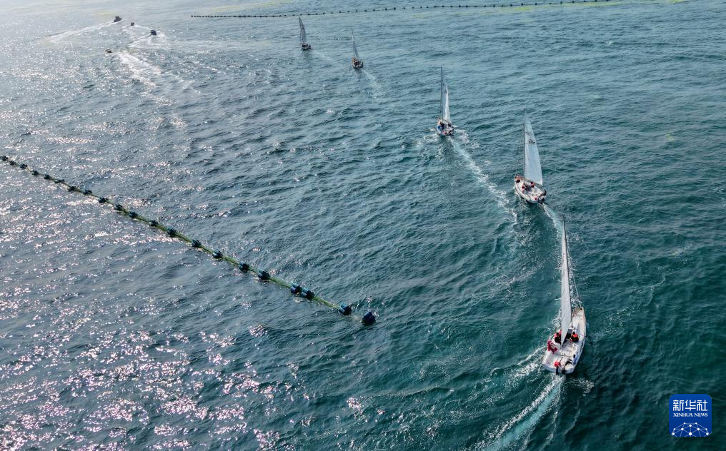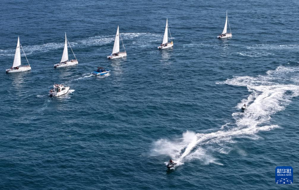 青岛小麦岛附近海域,市民和游客乘坐帆船参加海上巡游活动(7月10日摄,无人机照片)。新华社记者 李紫恒 摄