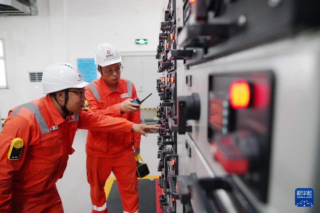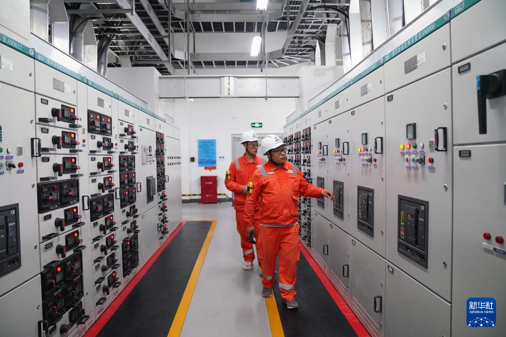 在“北气南下”能源大通道黑河首站配电间,综合维修工人在检查设备供电状态(7月9日摄)。新华社记者 王松 摄