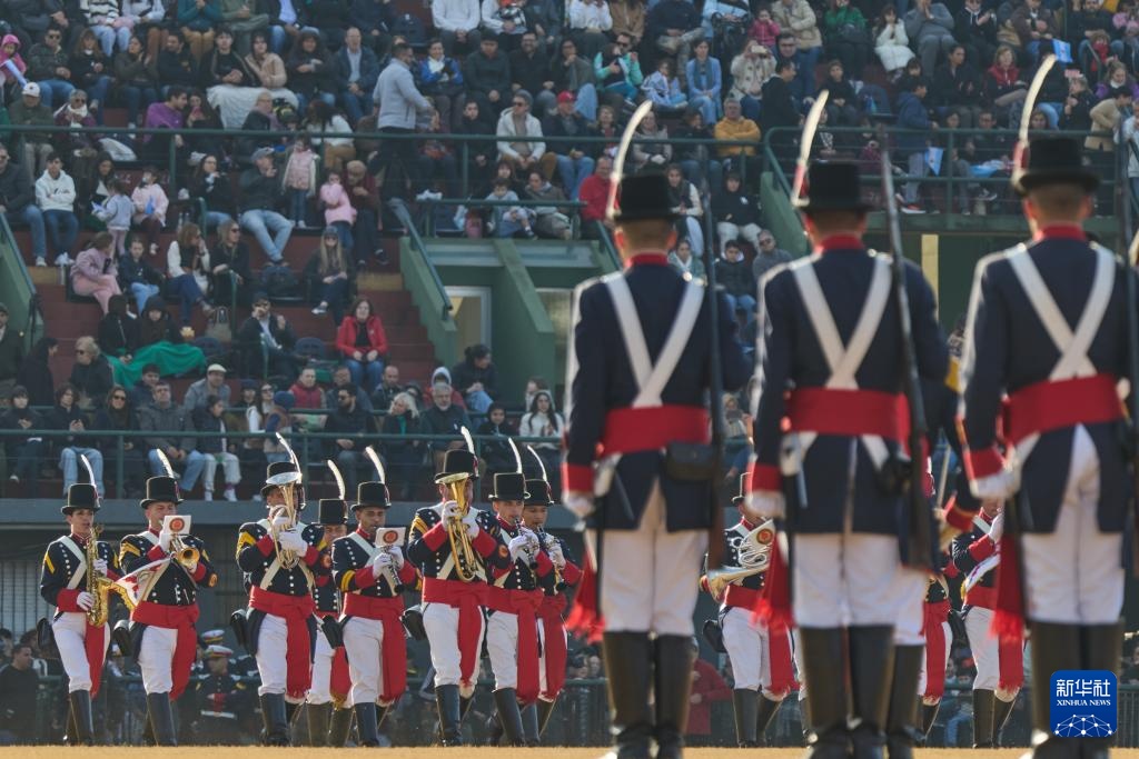 7月9日,在阿根廷首都布宜诺斯艾利斯,军乐队队员参加军乐节表演。新华社记者 孟鼎博 摄