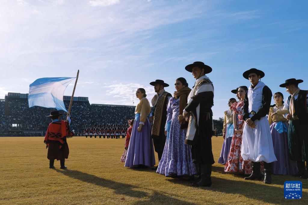 7月9日,在阿根廷首都布宜诺斯艾利斯,穿着传统服饰的民众参加军乐节。新华社记者 孟鼎博 摄
