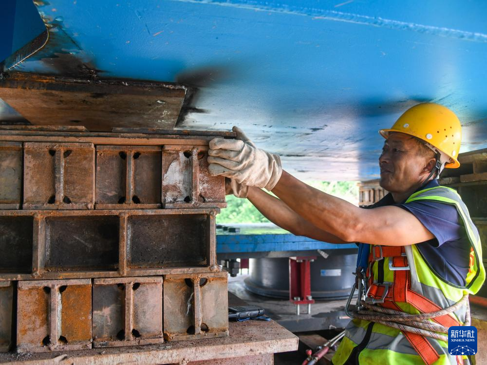 7月11日,工人在西渝高铁跨营达高速公路大桥进行顶推施工作业。新华社记者 王曦 摄