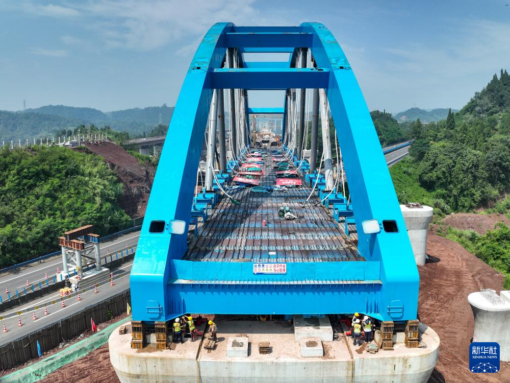 这是7月11日拍摄的正在建设中的西渝高铁跨营达高速公路大桥(无人机照片)。新华社记者 王曦 摄