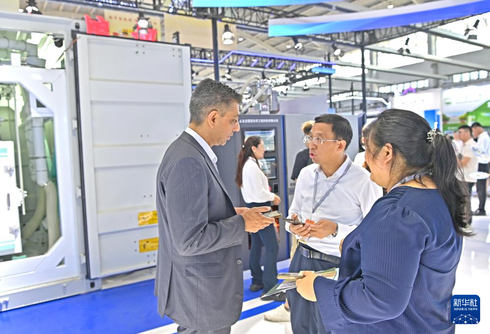 7月12日,国外客商在沈阳国际展览中心了解粮食加工机械。新华社记者 周华 摄