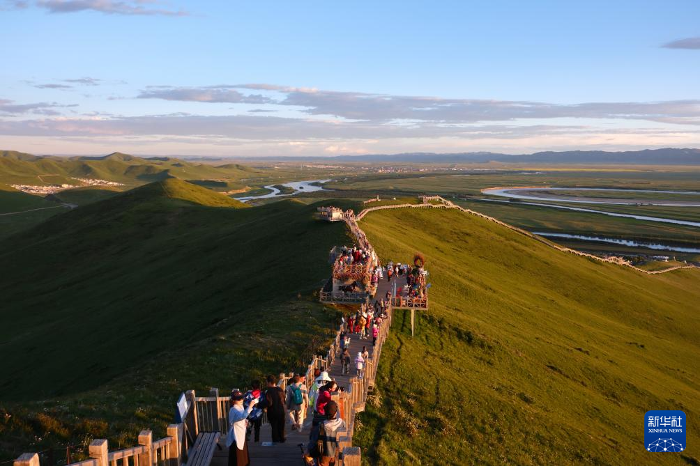 7月12日,游客行走在若尔盖九曲黄河第一湾景区栈道上。新华社记者 张雅雯 摄