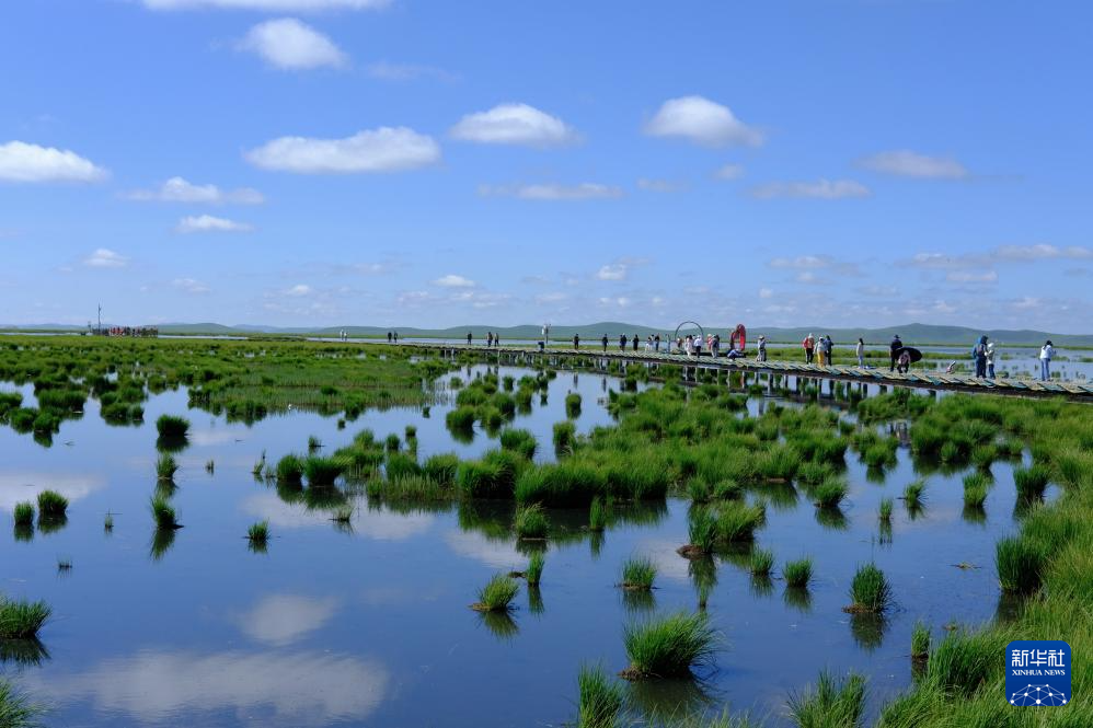 7月13日,游客行走在若尔盖花湖景区栈道上。新华社记者 唐文豪 摄