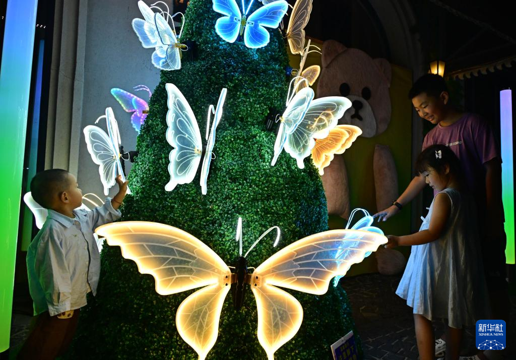 7月12日,小朋友在青岛红树林度假世界观看一组灯光作品。新华社记者 李紫恒 摄