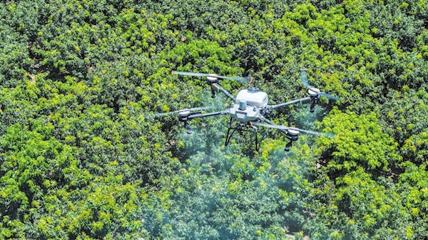 7月11日一早,琼山区大坡镇火山荔枝园内,一架无人机仿若“钢铁蜻蜓”般在空中巡航,向田间喷洒细密的“雨雾”。种植户王为庆手握摇杆,灵活操控无人机航向。“这高科技‘农具’让施肥打药更精准,效率提高还省肥料省农药。”他告诉记者,忙完自家荔枝、槟榔园的活,还要去帮助其他农户作业。