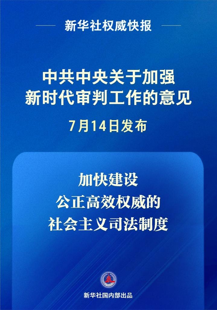 《中共中央关于加强新时代审判工作的意见》7月14日发布。意见指出,人民法院是国家的审判机关,承担着惩罚犯罪、保护人民,定分止争、维护公正的重要职能。