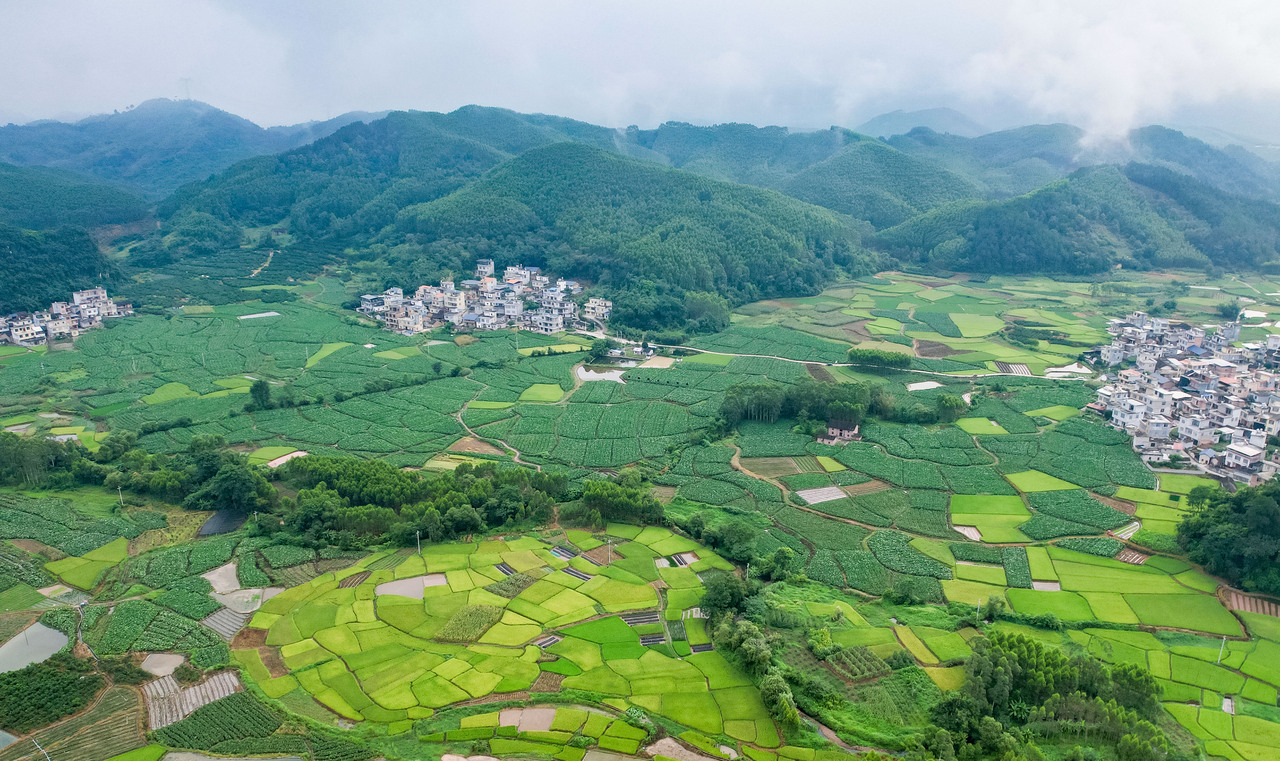 7月13日,广西桂林荔浦杜莫镇芋头种植示范基地,芋头田地、村舍、青山相互融合,形成一幅和美乡村振兴图。