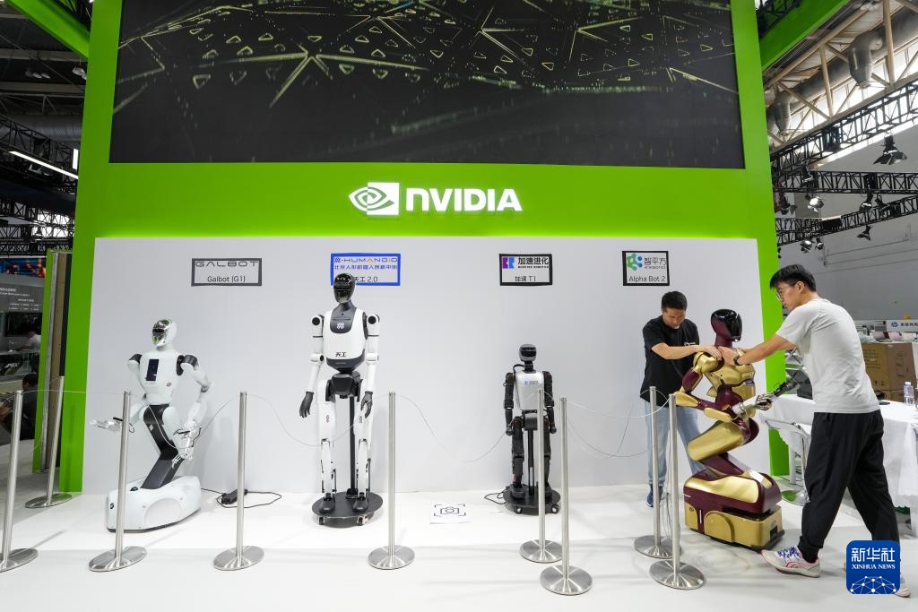 7月14日,在第三届中国国际供应链促进博览会数字科技链展区英伟达公司展位,工作人员在布置展品。新华社记者 鞠焕宗 摄