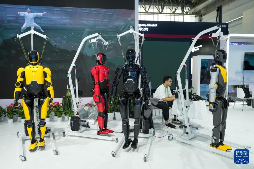 7月14日,在第三届中国国际供应链促进博览会数字科技链展区的“湖北人形机器人产业链专题展区”,工作人员在布置展品。新华社记者 鞠焕宗 摄