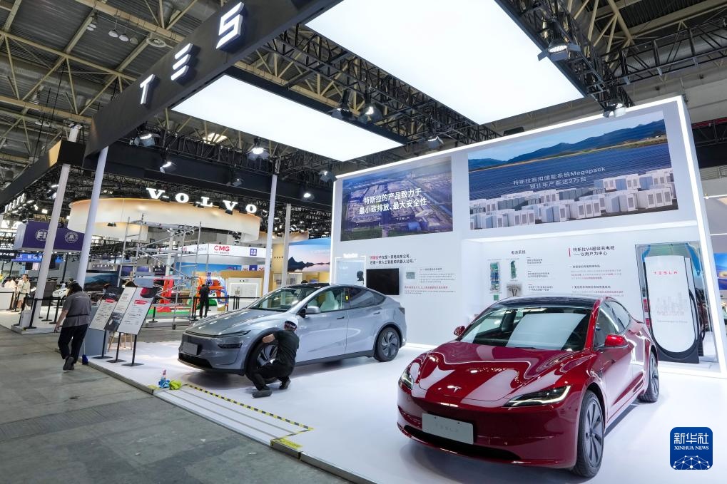 7月14日在第三届中国国际供应链促进博览会智能汽车链展区拍摄的特斯拉展位。新华社记者 鞠焕宗 摄