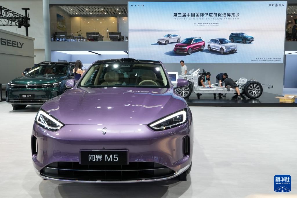 7月14日在第三届中国国际供应链促进博览会智能汽车链展区拍摄的问界展位。新华社记者 鞠焕宗 摄
