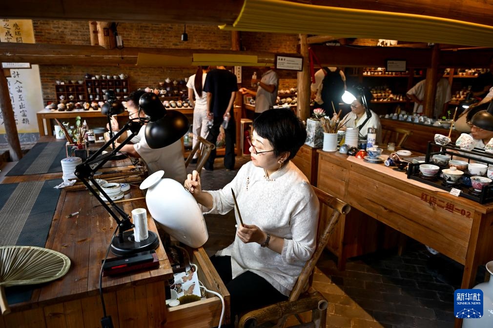 7月13日,在江西省景德镇市陶阳里历史文化街区,包括国家级非遗传统粉彩瓷制作技艺传承人傅长敏(中)在内的一批陶瓷手工技艺传承人进行现场创作。新华社记者 刘金海 摄