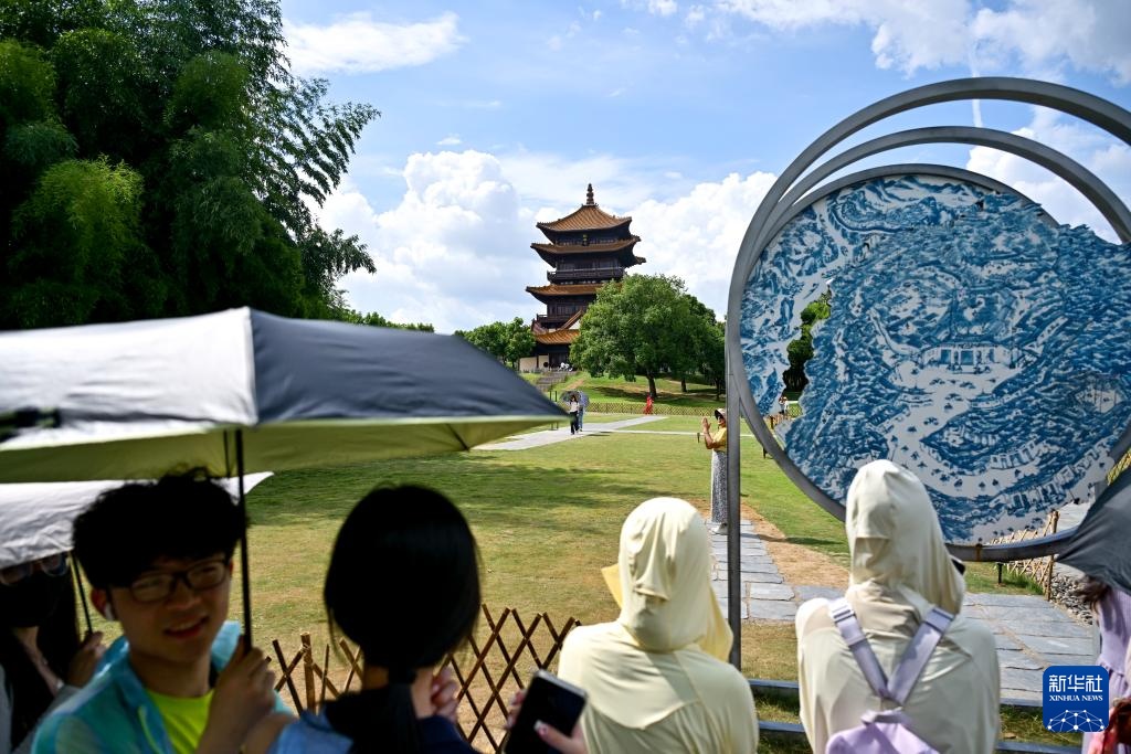 7月13日,游客在江西省景德镇市陶阳里历史文化街区一处网红打卡点排队留影。新华社记者 刘金海 摄