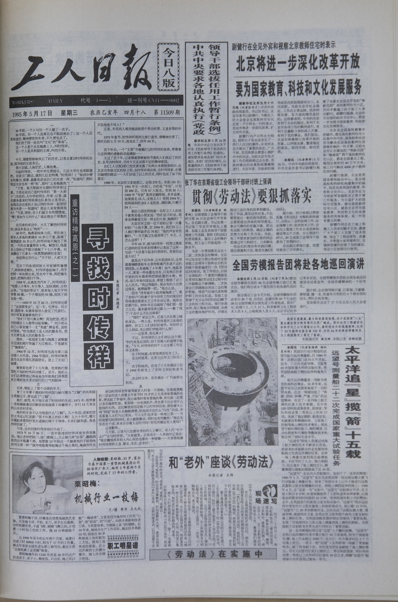 1995年5月17日至19日,工人日报刊发《重访精神高原》系列报道:《寻找时传祥》《铁人留下的试题》《面对孟泰的雕像》。