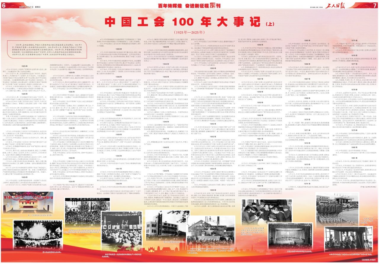 2025年4月27日至28日,工人日报推出《百年铸辉煌 奋进新征程特刊》庆祝全国总工会成立100周年。