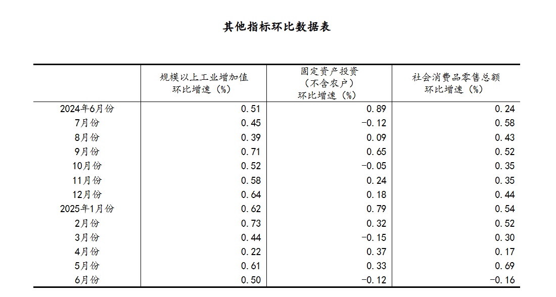 (2)根据季节调整模型自动修正结果,对近一年来各期国内生产总值、规模以上工业增加值、固定资产投资(不含农户)、社会消费品零售总额环比增速进行修订。修订结果及2025年二季度GDP环比数据、2025年6月份其他指标环比数据如下: