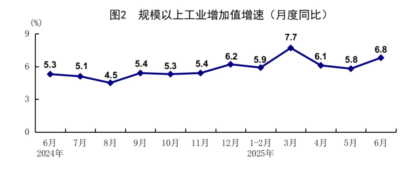 上半年,全国规模以上工业增加值同比增长6.4%。分三大门类看,采矿业增加值同比增长6.0%,制造业增长7.0%,电力、热力、燃气及水生产和供应业增长1.9%。装备制造业增加值同比增长10.2%,高技术制造业增加值增长9.5%,增速分别快于全部规模以上工业3.8和3.1个百分点。分经济类型看,国有控股企业增加值同比增长4.2%;股份制企业增长6.9%,外商及港澳台投资企业增长4.3%;私营企业增长6.7%。分产品看,3D打印设备、新能源汽车、工业机器人产品产量同比分别增长43.1%、36.2%、35.6%。6月份,规模以上工业增加值同比增长6.8%,环比增长0.50%。6月份,制造业采购经理指数为49.7%,比上月上升0.2个百分点;企业生产经营活动预期指数为52.0%。1-5月份,全国规模以上工业企业实现利润总额27204亿元,同比下降1.1%。