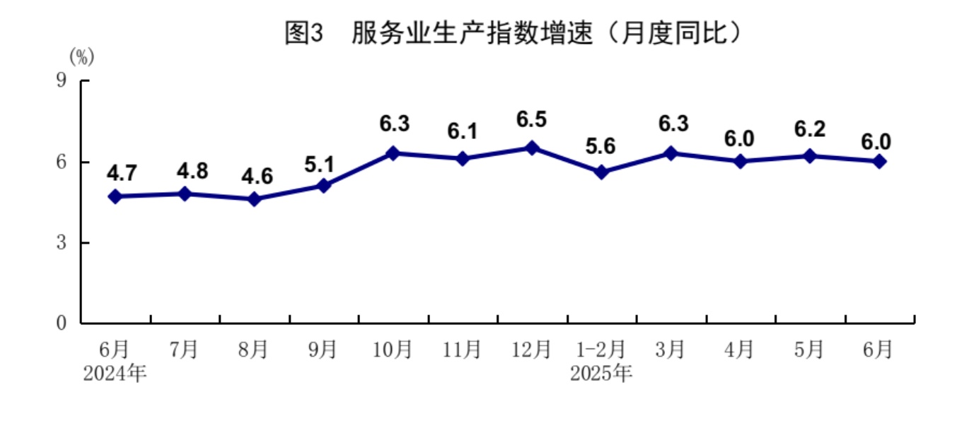 上半年,服务业增加值同比增长5.5%,比一季度加快0.2个百分点。其中,信息传输、软件和信息技术服务业,租赁和商务服务业,交通运输、仓储和邮政业,批发和零售业增加值分别增长11.1%、9.6%、6.4%、5.9%。6月份,全国服务业生产指数同比增长6.0%。其中,信息传输、软件和信息技术服务业,租赁和商务服务业,金融业,批发和零售业生产指数分别增长11.6%、8.4%、7.3%、6.9%。1-5月份,规模以上服务业企业营业收入同比增长8.1%。6月份,服务业商务活动指数为50.1%,服务业业务活动预期指数为56.0%。其中,邮政、电信广播电视及卫星传输服务、互联网软件及信息技术服务、货币金融服务、资本市场服务、保险等行业商务活动指数位于55.0%以上较高景气区间。