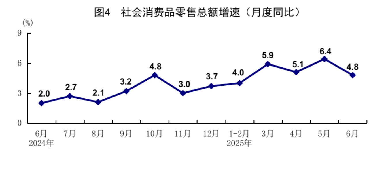 上半年,社会消费品零售总额245458亿元,同比增长5.0%,比一季度加快0.4个百分点。按经营单位所在地分,城镇消费品零售额213050亿元,同比增长5.0%;乡村消费品零售额32409亿元,增长4.9%。按消费类型分,商品零售额217978亿元,增长5.1%;餐饮收入27480亿元,增长4.3%。基本生活类和部分升级类商品销售增势较好,限额以上单位粮油食品类、体育娱乐用品类、金银珠宝类商品零售额分别增长12.3%、22.2%、11.3%。消费品以旧换新政策持续显效,限额以上单位家用电器和音像器材类、文化办公用品类、通讯器材类、家具类商品零售额分别增长30.7%、25.4%、24.1%、22.9%。全国网上零售额74295亿元,同比增长8.5%。其中,实物商品网上零售额61191亿元,增长6.0%,占社会消费品零售总额的比重为24.9%。6月份,社会消费品零售总额同比增长4.8%,环比下降0.16%。上半年,服务零售额同比增长5.3%,比一季度加快0.3个百分点。