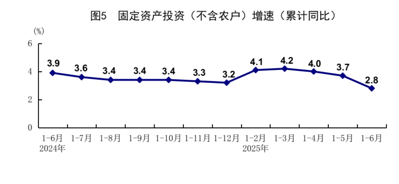 上半年,全国固定资产投资(不含农户)248654亿元,同比增长2.8%;扣除房地产开发投资,全国固定资产投资增长6.6%。分领域看,基础设施投资同比增长4.6%,制造业投资增长7.5%,房地产开发投资下降11.2%。全国新建商品房销售面积45851万平方米,同比下降3.5%;新建商品房销售额44241亿元,下降5.5%。分产业看,第一产业投资同比增长6.5%,第二产业投资增长10.2%,第三产业投资下降1.1%。民间投资同比下降0.6%;扣除房地产开发投资,其他民间投资增长5.1%。高技术产业中,信息服务业,航空、航天器及设备制造业,计算机及办公设备制造业投资同比分别增长37.4%、26.3%、21.5%。6月份,固定资产投资(不含农户)环比下降0.12%。