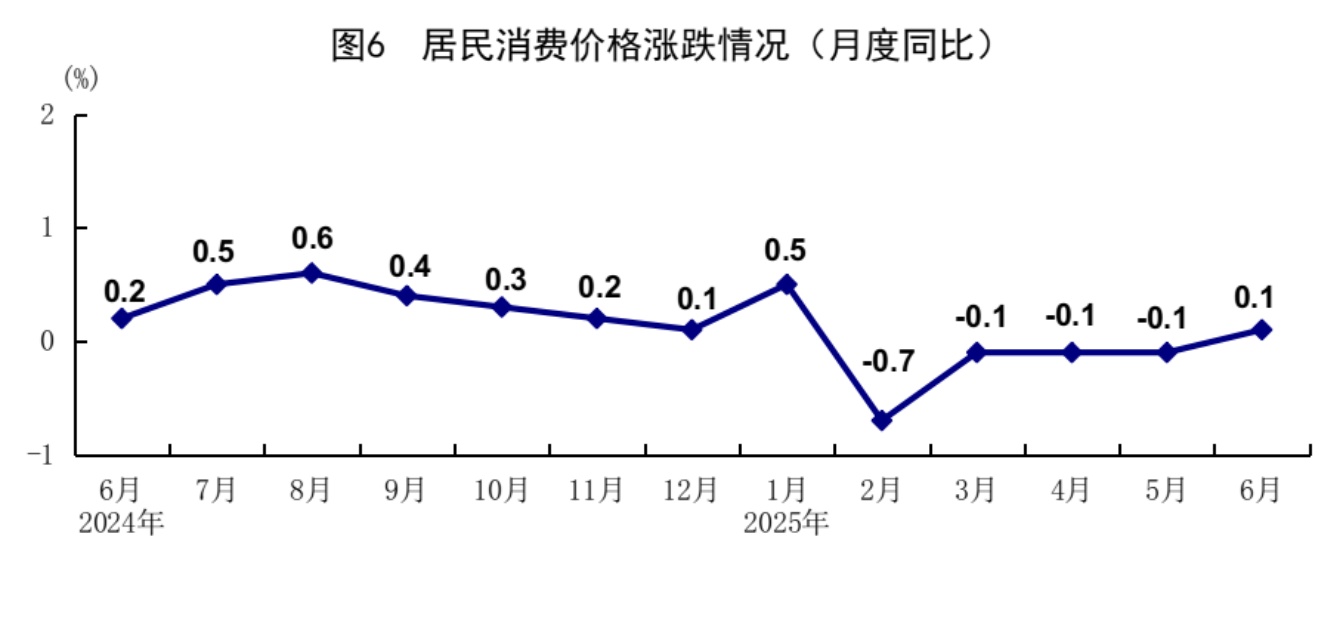 上半年,全国居民消费价格(CPI)同比下降0.1%。分类别看,食品烟酒价格下降0.3%,衣着价格上涨1.3%,居住价格上涨0.1%,生活用品及服务价格持平,交通通信价格下降2.9%,教育文化娱乐价格上涨0.8%,医疗保健价格上涨0.3%,其他用品及服务价格上涨6.7%。在食品烟酒价格中,鲜菜价格下降5.3%,粮食价格下降1.3%,鲜果价格上涨2.7%,猪肉价格上涨3.8%。6月份,全国居民消费价格同比上涨0.1%,环比下降0.1%。上半年,扣除食品和能源价格后的核心CPI同比上涨0.4%,比一季度扩大0.1个百分点。其中,6月份核心CPI同比上涨0.7%,比上月扩大0.1个百分点。
