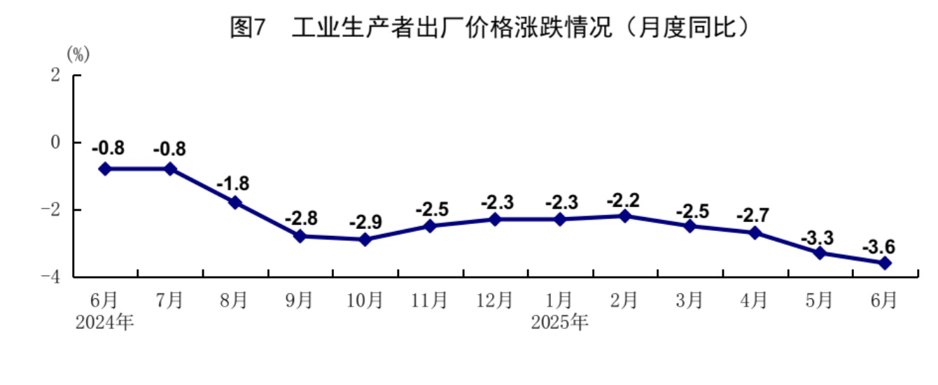 上半年,全国工业生产者出厂价格同比下降2.8%。其中,6月份同比下降3.6%,环比下降0.4%。上半年,工业生产者购进价格同比下降2.9%。其中,6月份同比下降4.3%,环比下降0.7%。