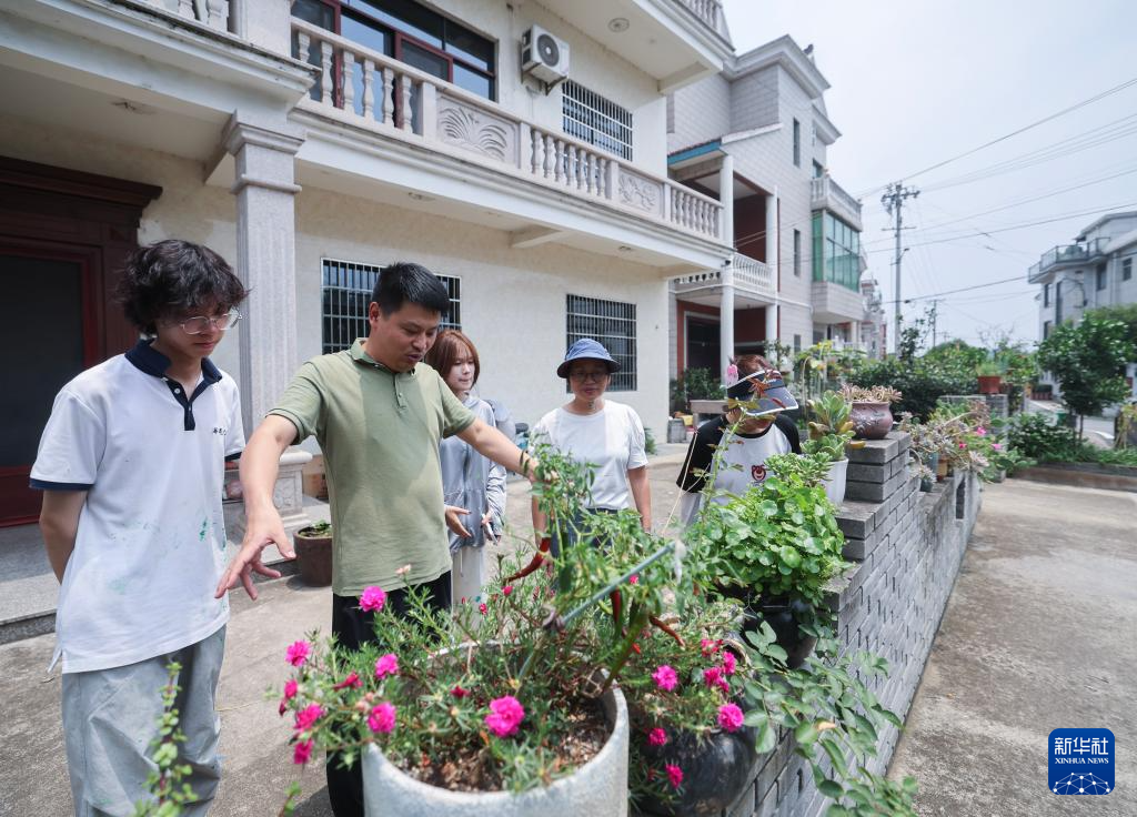 7月15日,在诸暨市安华镇丰江周村,绍兴市文化特派员陈航峰(左二)带着浙江农林大学暨阳学院的学生们走访村舍庭院,并提出美丽庭院的设计意见。新华社记者 徐昱 摄