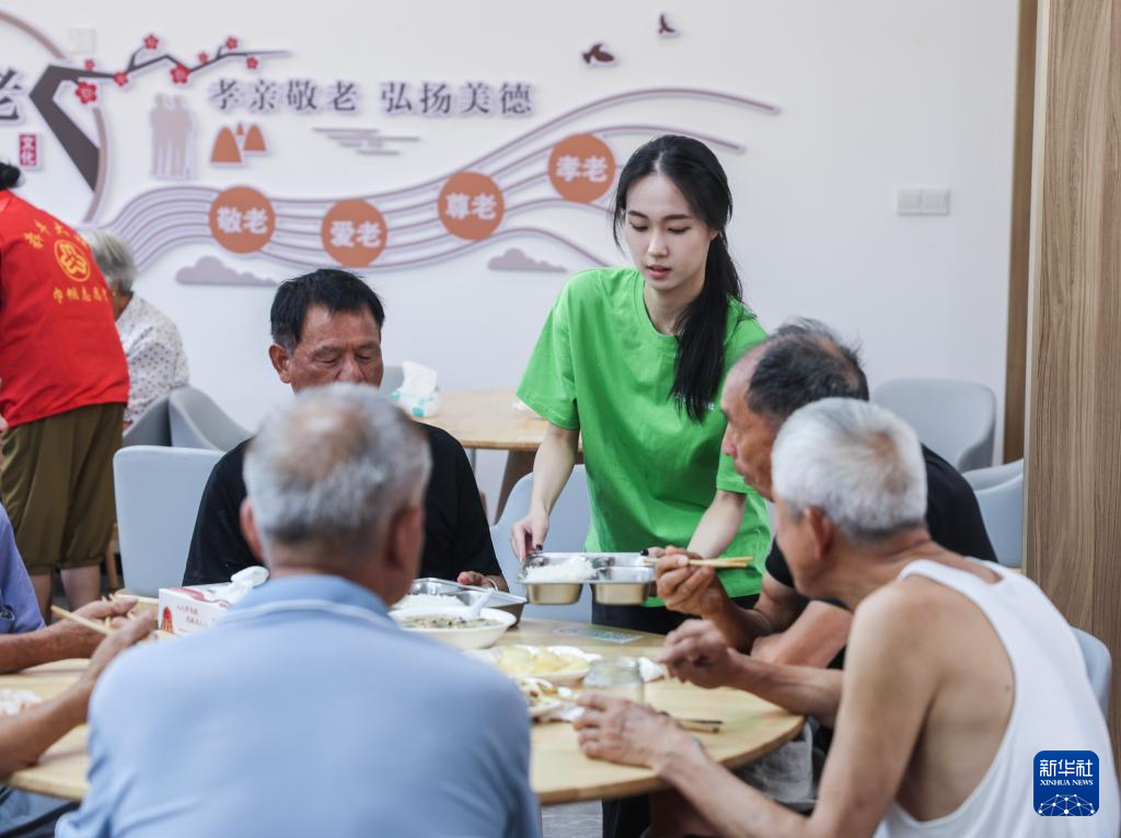 7月15日,在诸暨市安华镇丰江周村爱心食堂,浙江农林大学暨阳学院的学生开展助餐志愿服务。新华社记者 徐昱 摄