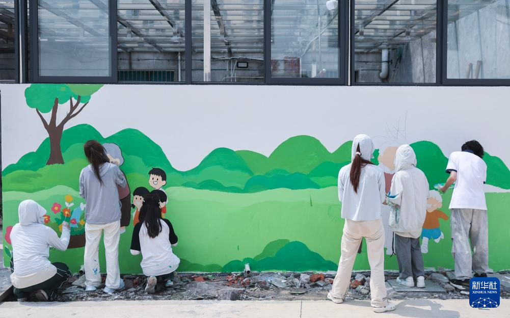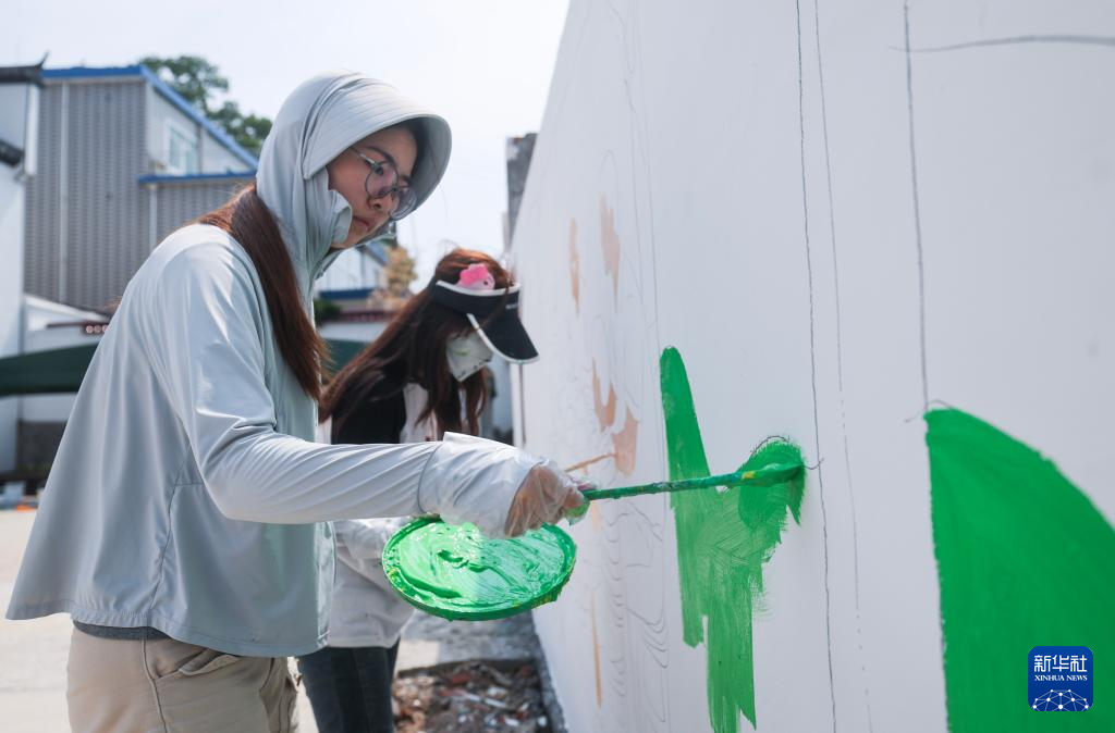 7月15日,在诸暨市安华镇丰江周村,浙江农林大学暨阳学院设计专业的学生们创作墙绘,美化乡村人居环境。新华社记者 徐昱 摄