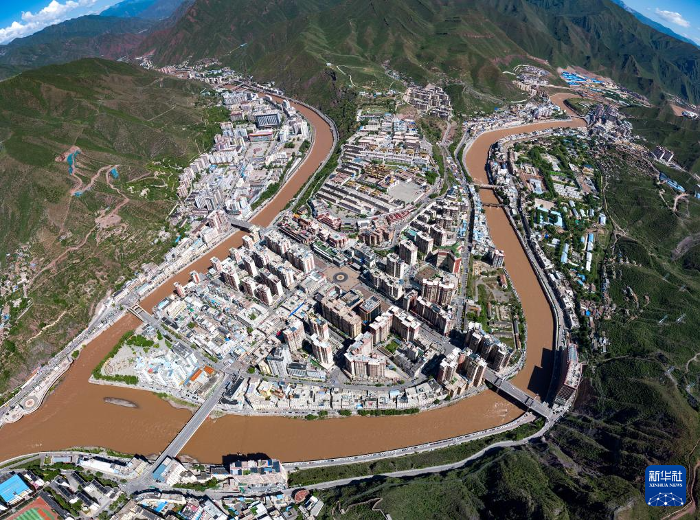 红棕色的河水波涛汹涌,砖红色的山脉连绵不绝。山水间的红土地上,房屋、桥梁、广场等带有红色装饰的建筑错落分布,将这座历史悠久的藏东山城装点成一幅立体的油画。