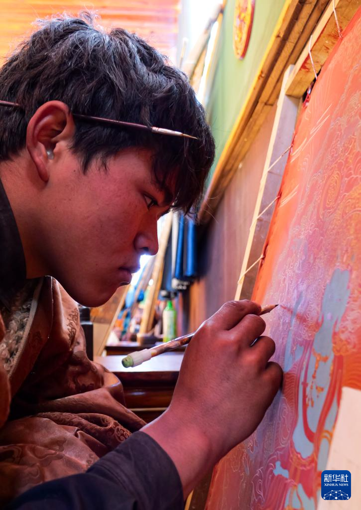2024年11月22日,昌都市丁青县拥忠文化艺术中心非遗扶贫就业工坊学员在画唐卡。新华社记者 格桑朗杰 摄