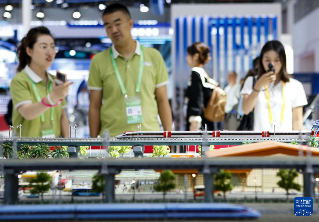 7月17日,在先进制造链展区中国中车展台,参会者观看中车高速轨道交通装备系统沙盘。新华社记者 丁洪法 摄