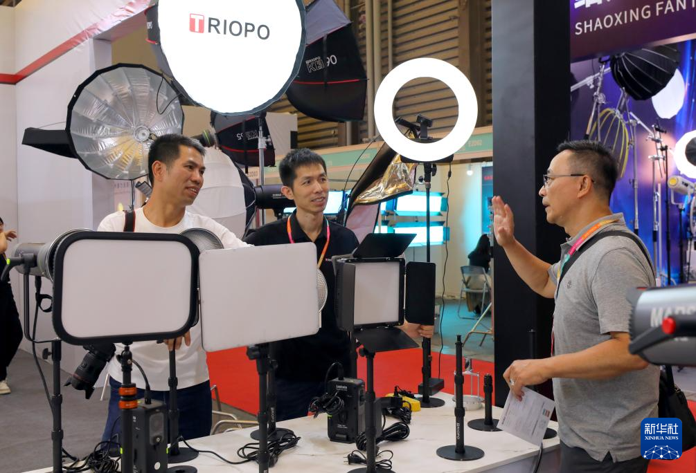 7月17日,参观者在一组摄影灯具展品前交流讨论。新华社记者 方喆 摄