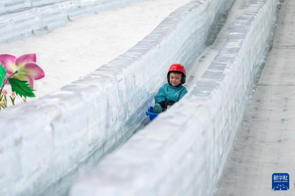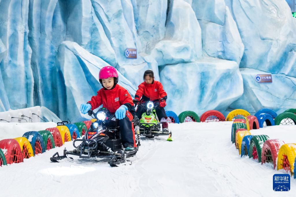7月17日,游客在长沙湘江欢乐城欢乐雪域体验冰上自行车等项目。新华社记者 陈思汗 摄