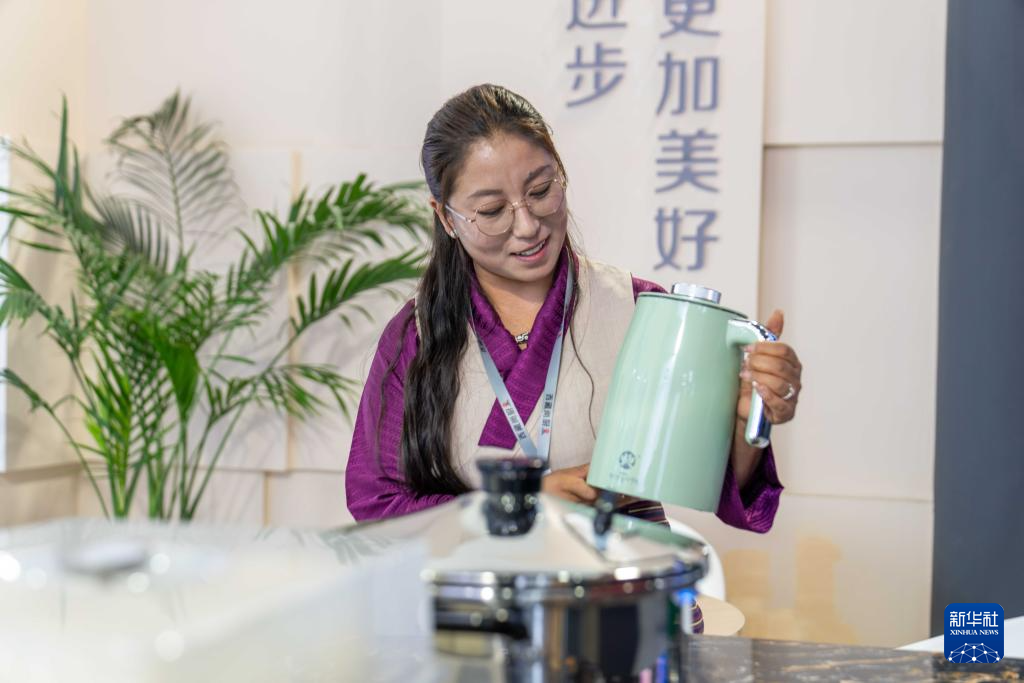 7月17日,西藏某炊具公司员工旦增卓嘎在展示其公司产品。新华社记者 旦增尼玛曲珠 摄