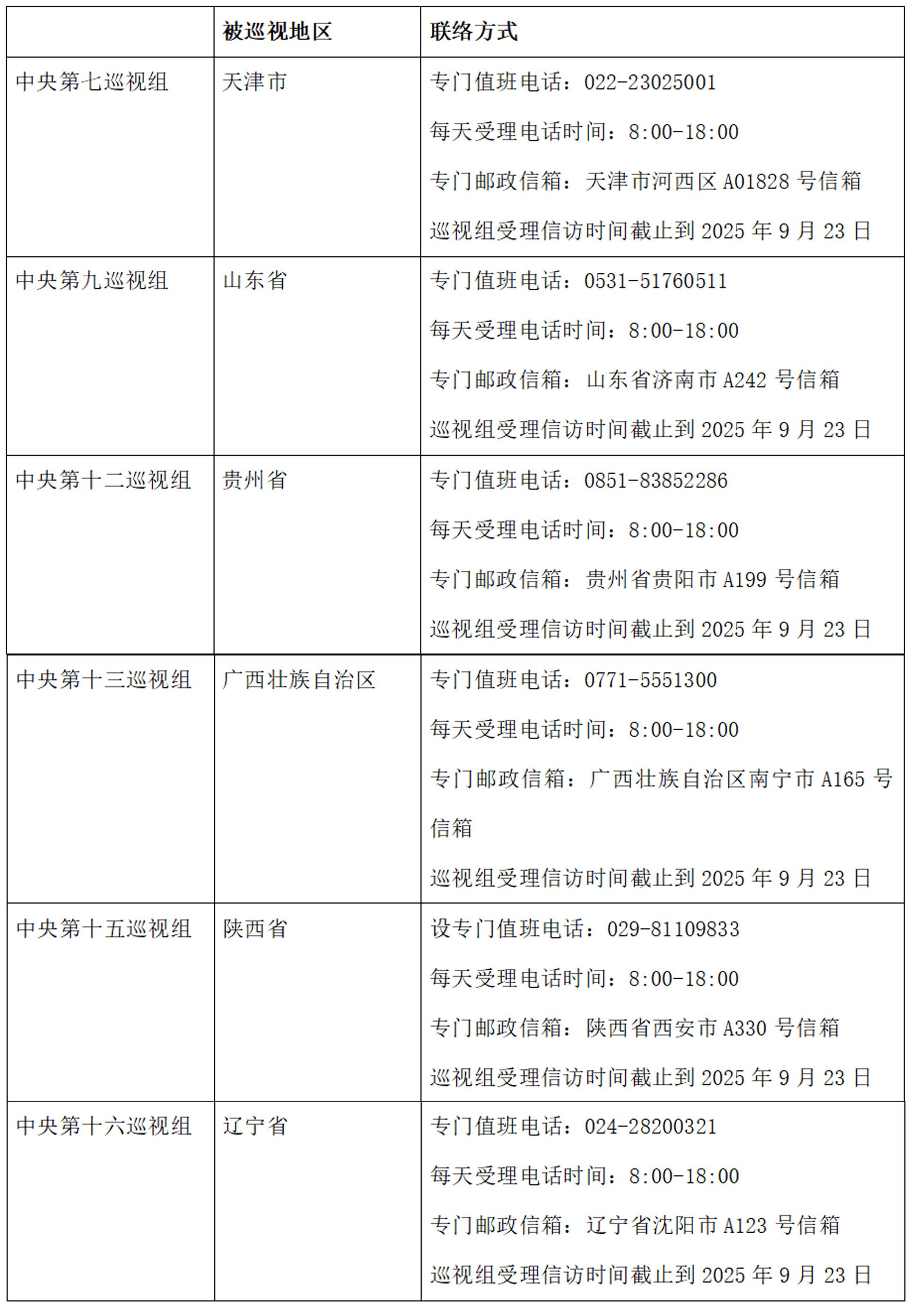根据党中央关于巡视工作的统一部署,近日,二十届中央第六轮巡视的16个巡视组陆续开始进驻被巡视地区,并公布了联系方式。