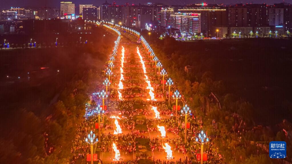 7月18日,在西昌市航天大道,88个火堆同时点燃(无人机照片)。新华社记者 胥冰洁 摄