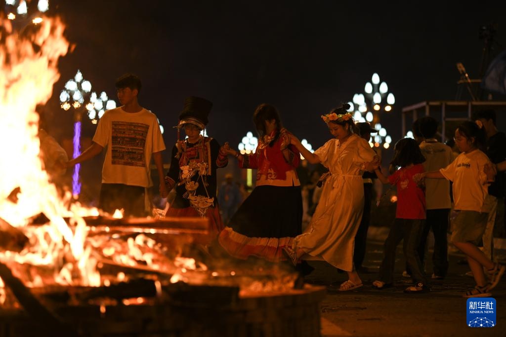 7月18日,市民围着火堆跳舞。新华社记者 胥冰洁 摄