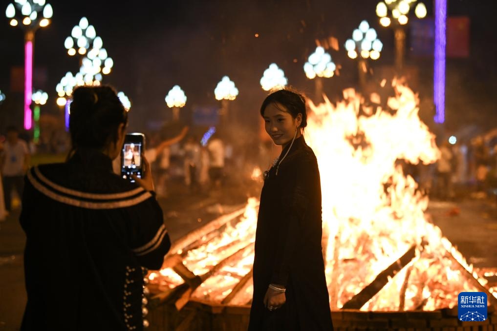 7月18日,市民在火堆前拍照。新华社记者 胥冰洁 摄
