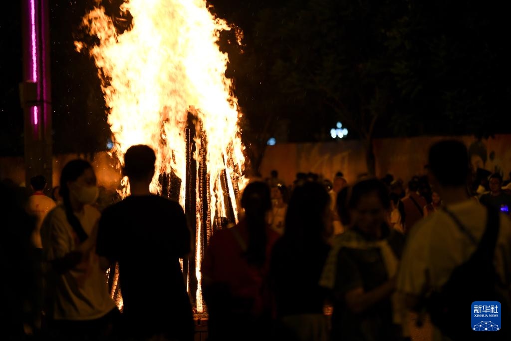 7月18日,市民从大型火堆中取火,点燃火把。新华社记者 胥冰洁 摄