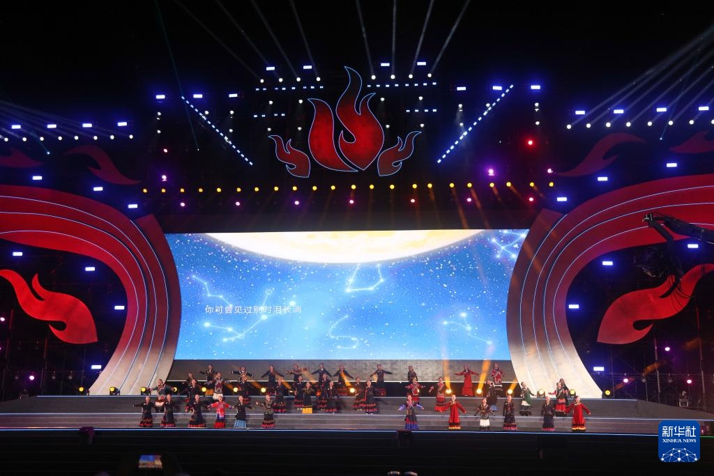 7月18日,来自凉山州普格县的妞妞合唱团在2025年凉山彝族火把节开幕式上演出。新华社记者 胥冰洁 摄