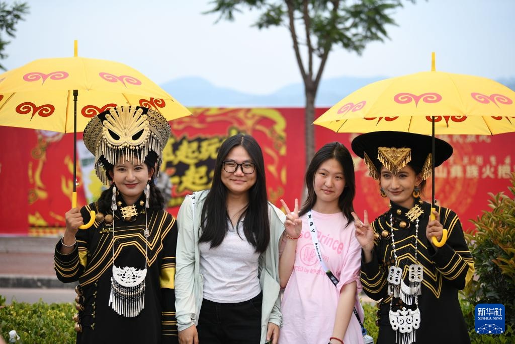 7月18日,游客与身着彝族服饰的演员合影。新华社记者 胥冰洁 摄