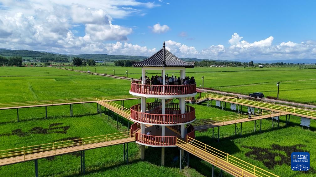7月18日,游客在吉林省和龙市光东村的稻田观光塔中游览(无人机照片)。新华社记者 邵泽东 摄