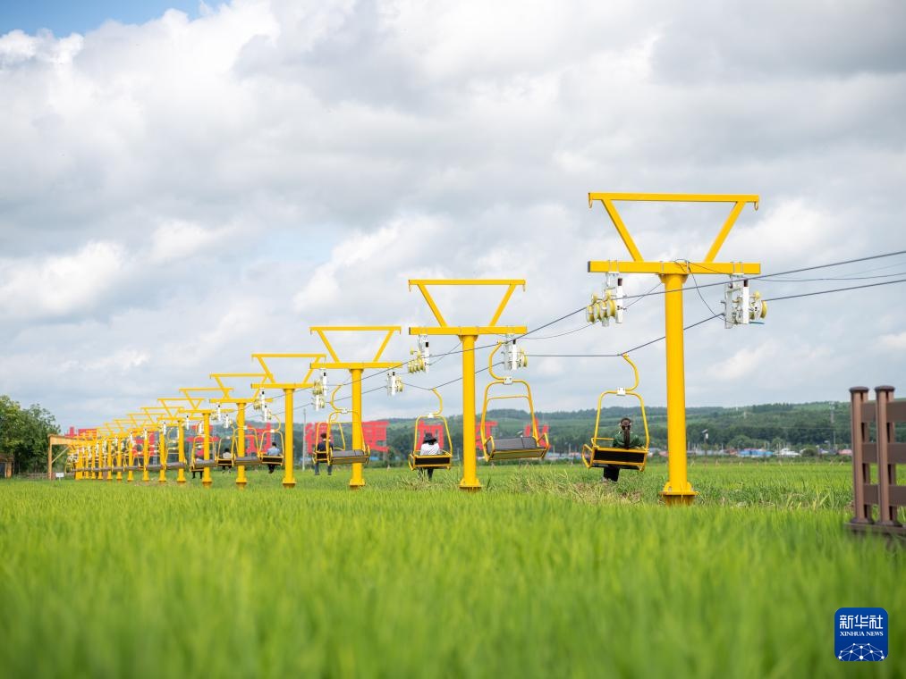 7月18日,在吉林省和龙市光东村,游客乘坐稻田低空缆车游览。新华社记者 邵泽东 摄