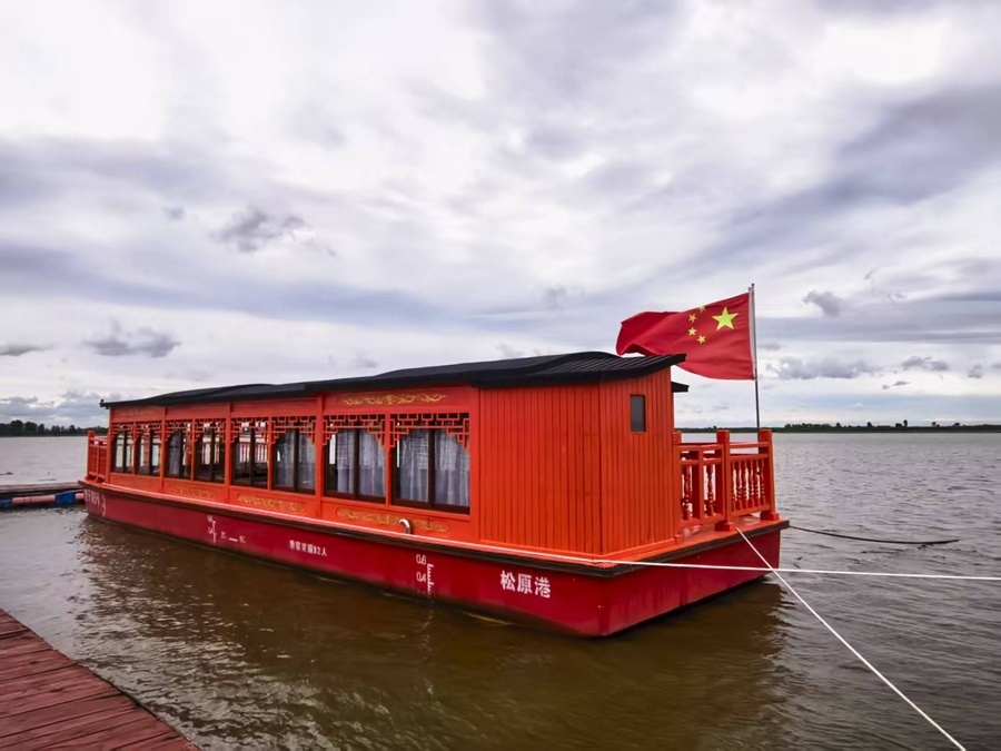 7月20日,一艘游船停泊在查干湖水面上。新华网记者 唐斓 摄