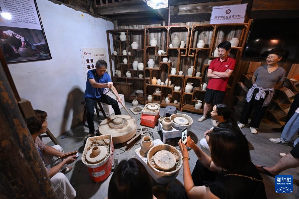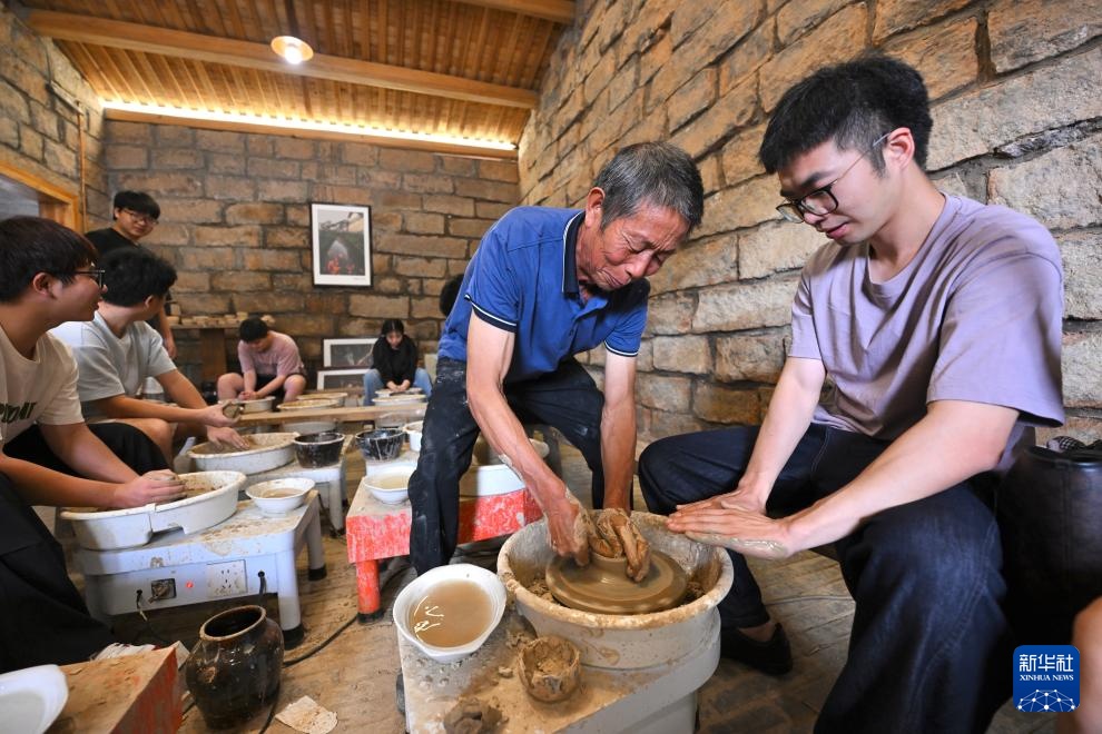 7月18日,在周宁县浦源镇萌源村月山古龙窑制作间,肖家涨(左)在向前来参观研学的华侨大学学生演示拉坯制硋技艺。新华社记者 姜克红 摄