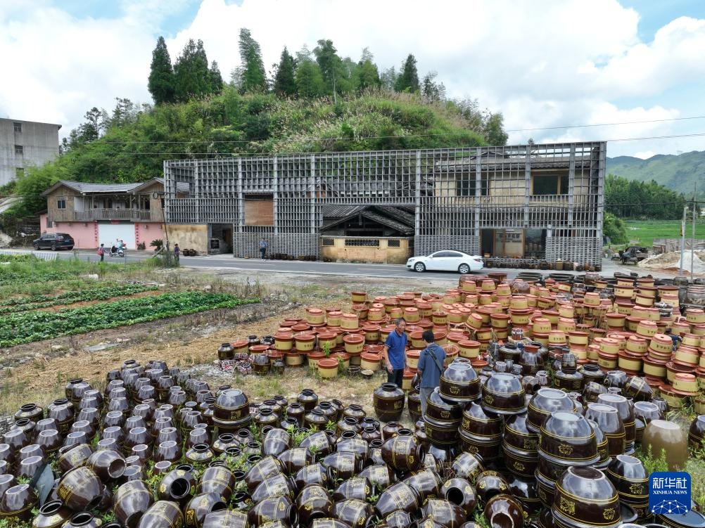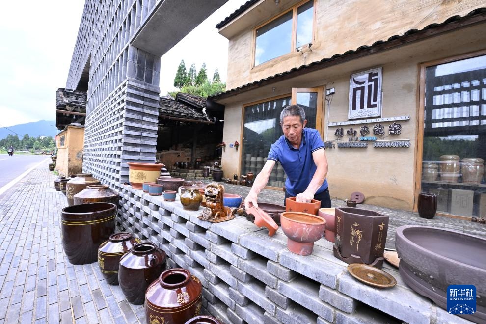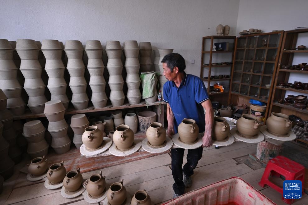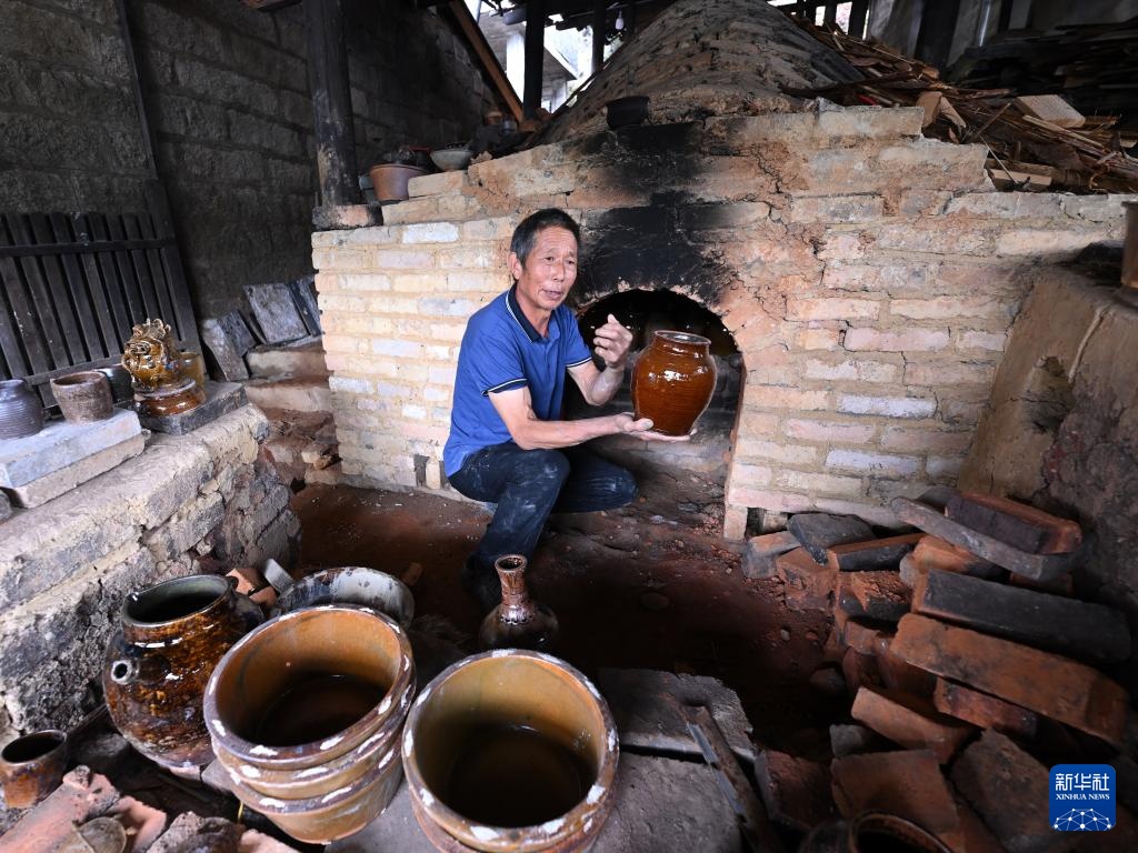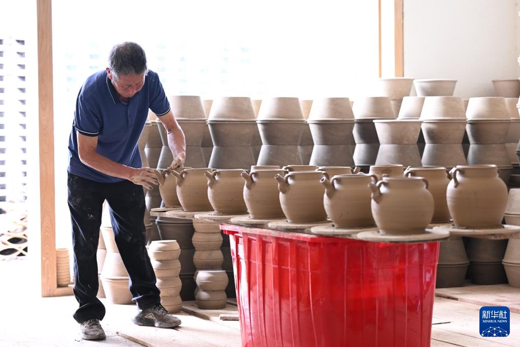 7月18日,在周宁县浦源镇萌源村月山古龙窑,肖家涨摆放展示用的传统硋器。新华社记者 姜克红 摄