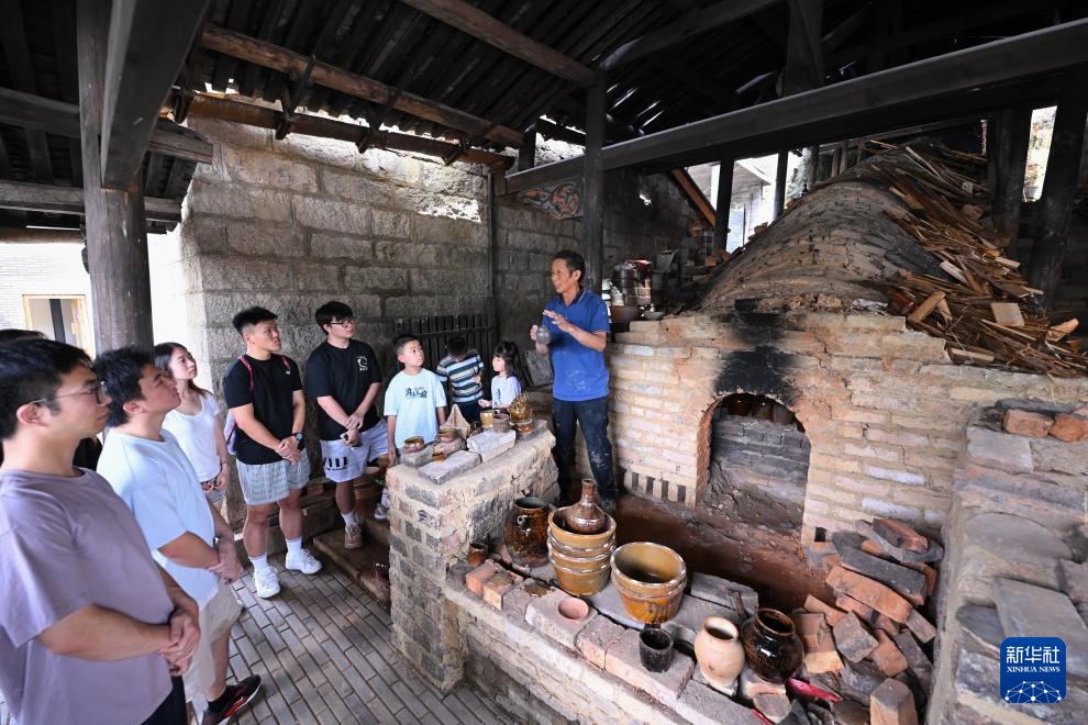 7月18日,在周宁县浦源镇萌源村月山古龙窑,肖家涨(右)在向前来参观研学的华侨大学师生介绍制硋知识。新华社记者 姜克红 摄